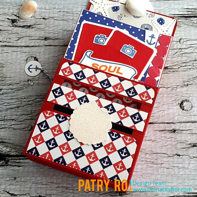 Con temática marina y combo color en los que se destacan los tonos azules, rojo y blanco, tenemos a continuación este proyecto realizado con elementos variados; en los que los sets de Latina Crafter han sido estampados a lo largo de cada una de sus páginas.